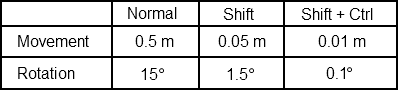 It is also possible to rotate objects with precision. Holding 'Shift' and 'Ctrl' + 'Shift' while rotating objects will rotate objects more and more precisely, respectively. Here is a table showing the exact values for movement and rotation: